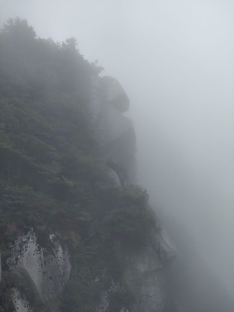 アプローチはトポに書いている字づらからだと非常にわかりにくく、どうやら一の壁の頭の位置を間違えていたようだ。一の壁の頭と思っていたところから右側の変なブッシュに入り、緊張するスラブのぼろいハーケンを頼りに登り、絶対ここじゃないよな?と思いながら進むが本当にそうではなかったようで最終的に立ち木に捨て縄を巻き懸垂下降で降りる。